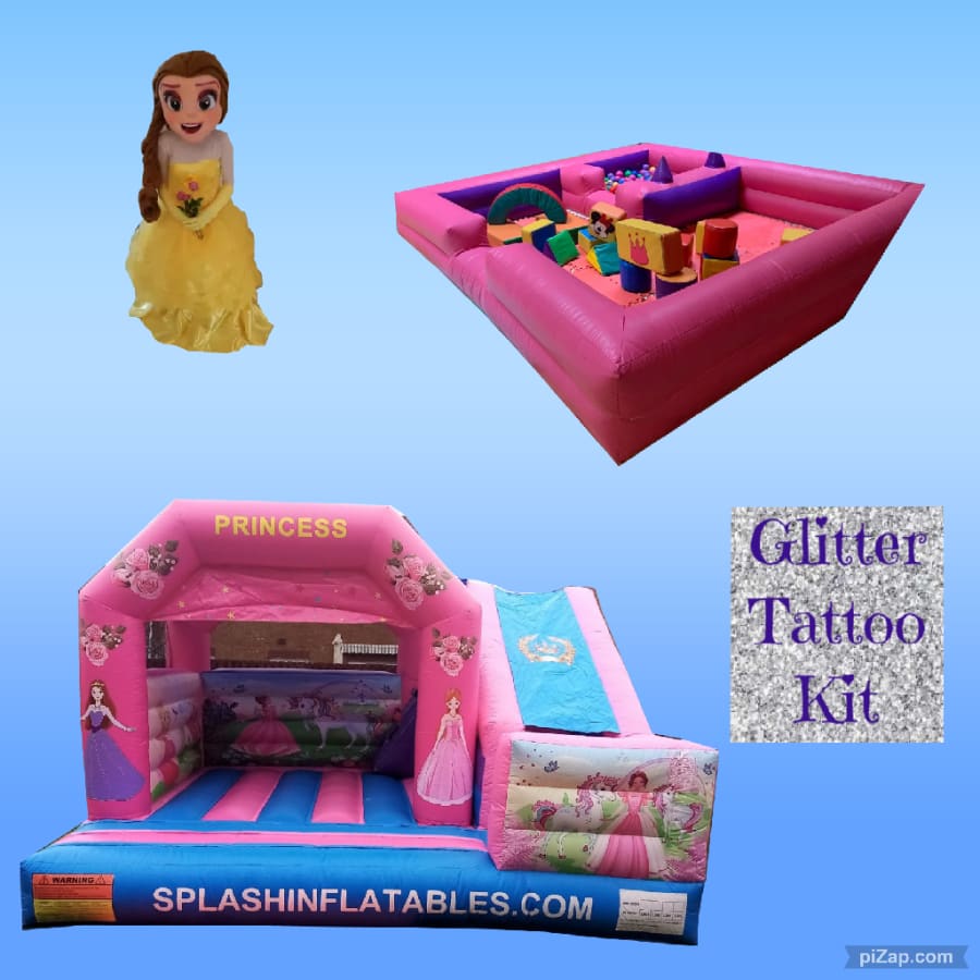 Choose one of our Princess castles with attached slide. Any Princess mascot, Glitter DIY Kit and soft play arena.