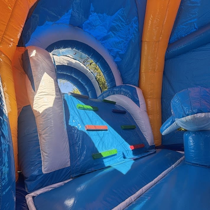 Make your way through the inflatable and then slide down the slide into a paddling pool filled with water!