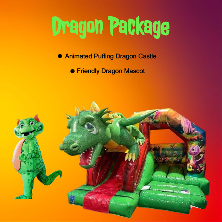 Our Dragon package includes a bouncy castle with slide and a dragon mascot!